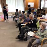 ユニークなレクリエーションが行われました。その名も「風船バレー大会」。スタッフが用意した風船を、利用者の皆さんがうちわで打ち返しながら、ゆるやかなバトルが繰り広げられました。写真では、スタッフが熱心にルールを説明する一方で、参加者たちは「これで勝ったら何がもらえるの?」と、すでに意気込み十分。