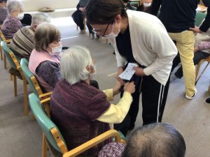 「袋の中身はなんだろな」を開催しました!袋の中に手を入れて、触った感触だけで中身を当てるこのゲーム。「これ、なんだろう…」「あんた、まだ触ってるの?」「ケーキが入ってるんかな?」と、大盛り上がり!中には「ぜったいリンゴや!」と自信満々の方もいらっしゃいましたが、正解は意外な小物だったりして、笑い声が絶えませんでした。手先や感覚を使う楽しい時間は、みんなの笑顔も倍増