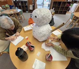 今回は「半紙で雪だるま作り」に挑戦しました。半紙をペタペタ貼りながら形を整えていく作業に、皆さん夢中。「ここに目を付けたら可愛いんじゃない?」「マフラーを描いてあげよう!」と、それぞれの個性あふれる雪だるまが完成しました!出来上がった作品を見て、「あらどうや、可愛らしいねぇ!」と皆さん満足そうな笑顔。お部屋の中でも冬を感じられる素敵なひとときとなりました